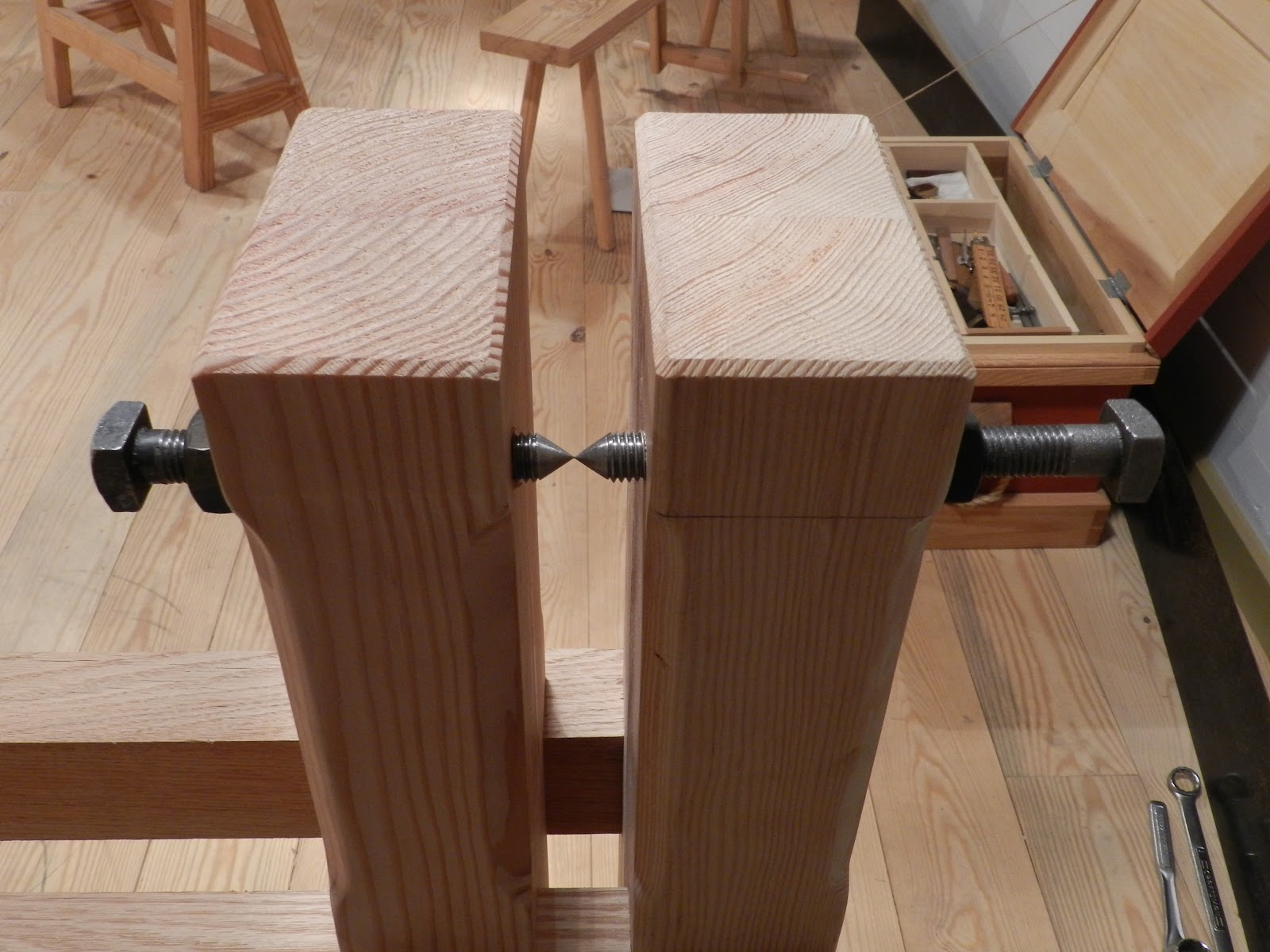 I think that pretty much catches things up. Now that the pikes are installed I can make the mortices for the arms that will hold the tool rest. Have to finish up the treadle and then go find an appropriate little tree for the actual spring pole. I can't wait to start turning on this thing. I have visions of joynt stools and joynt formes dancing in my head.